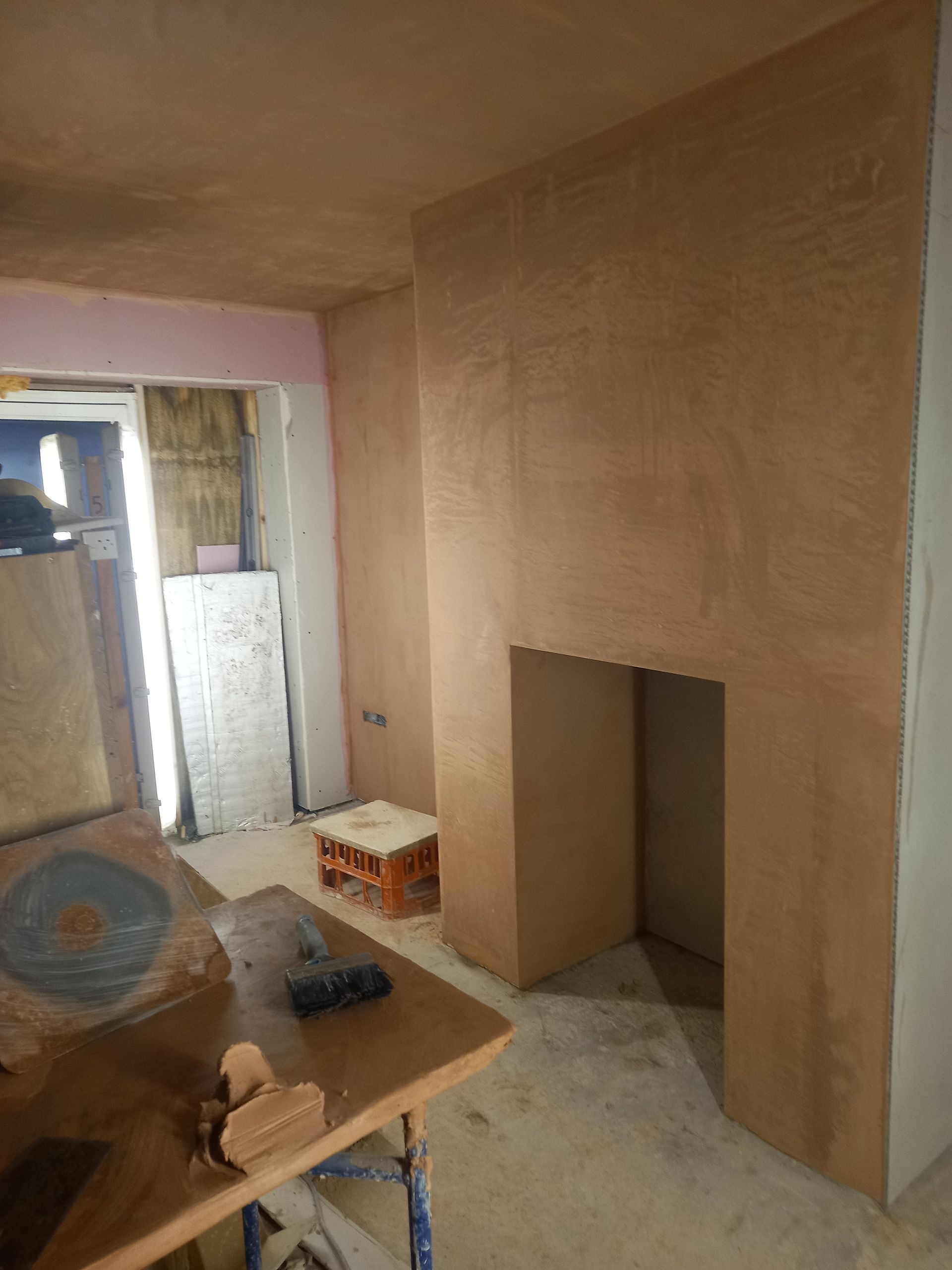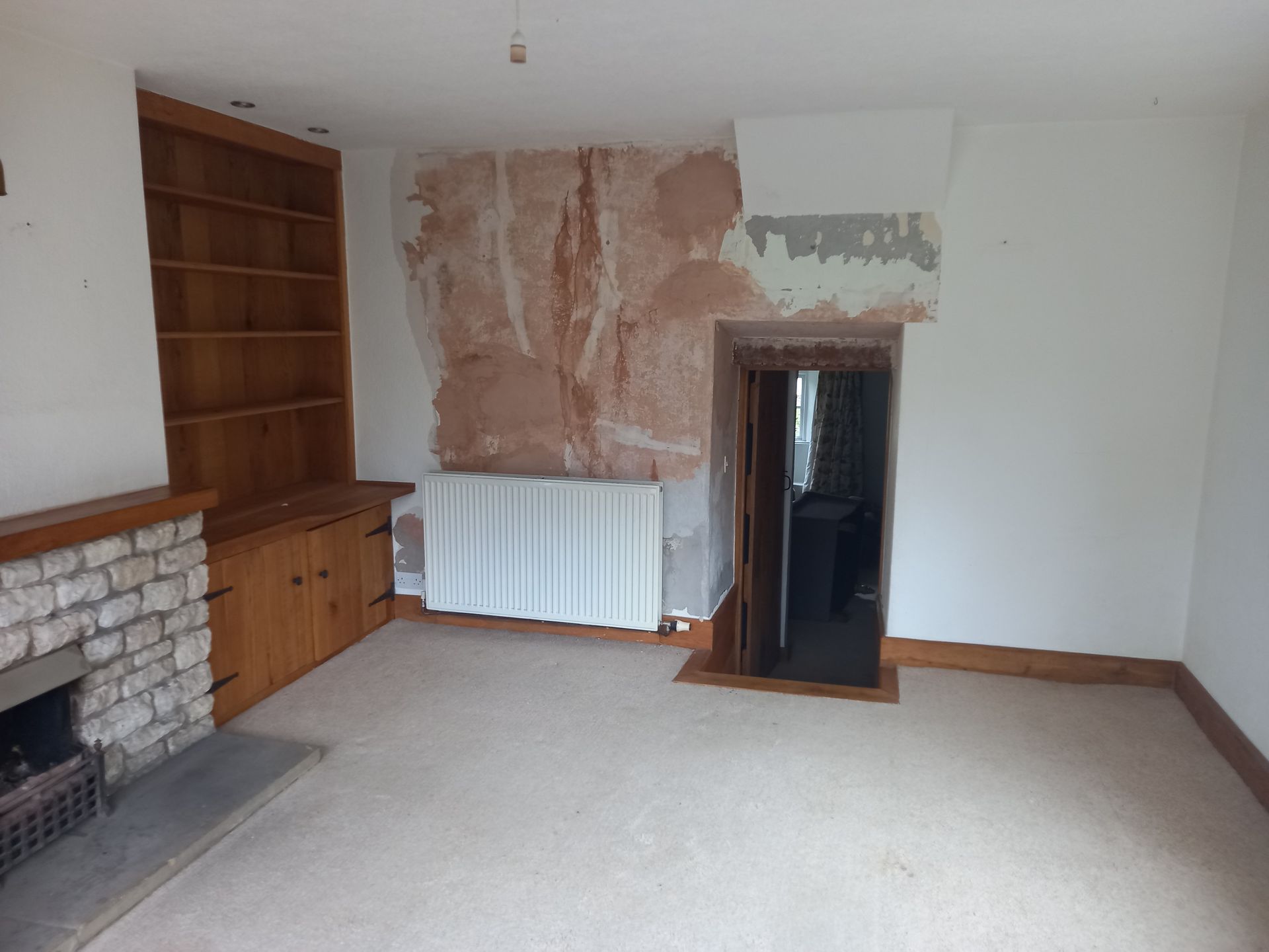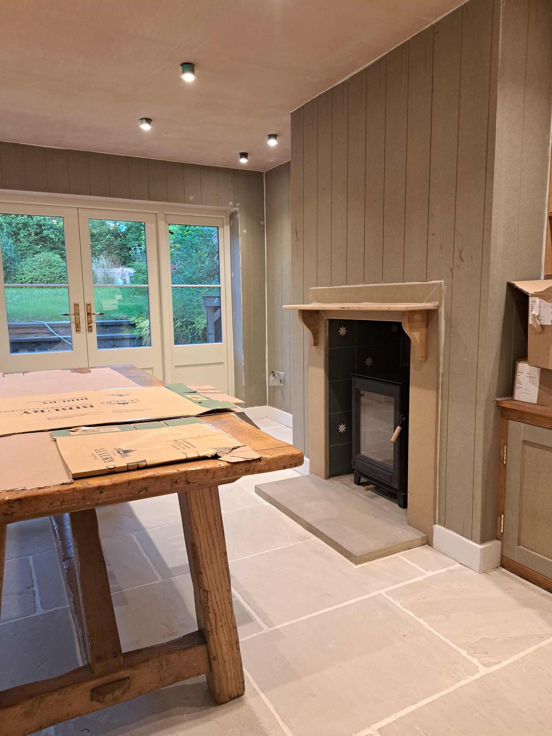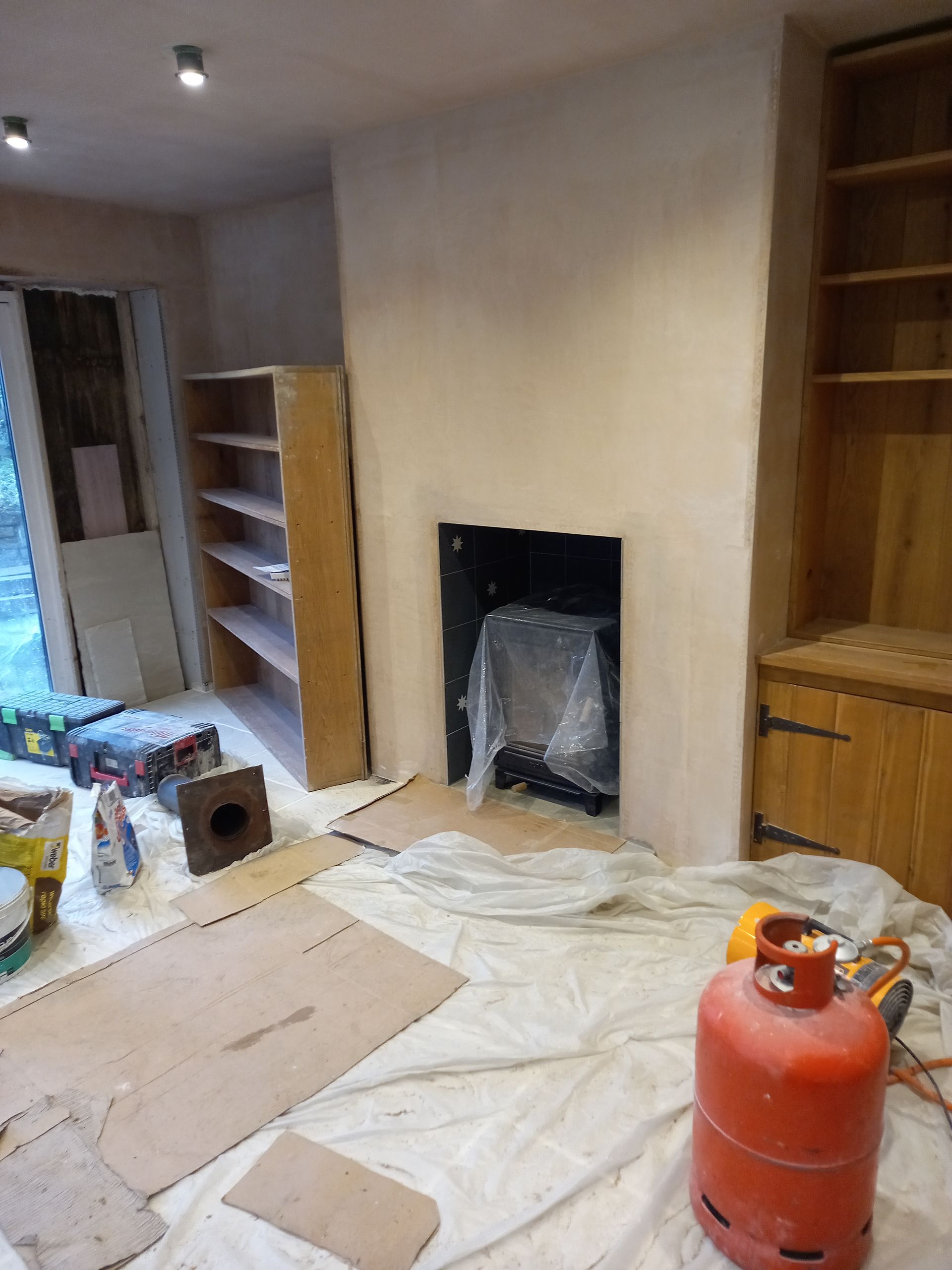Work is been carried out to refurbish and alter a room with-in Ascot Cottage which comprises of taking the old Upvc French doors and windows out and making the opening wider to fit a pair of Timber French doors with window and fan light. Work is also been carried out to re-build the chimney breast to allow for a log burner, fully strip out the old walls and dampproof the walls, lay a new tiled floor then fitting a bespoke cladding board to the walls along with seating area.