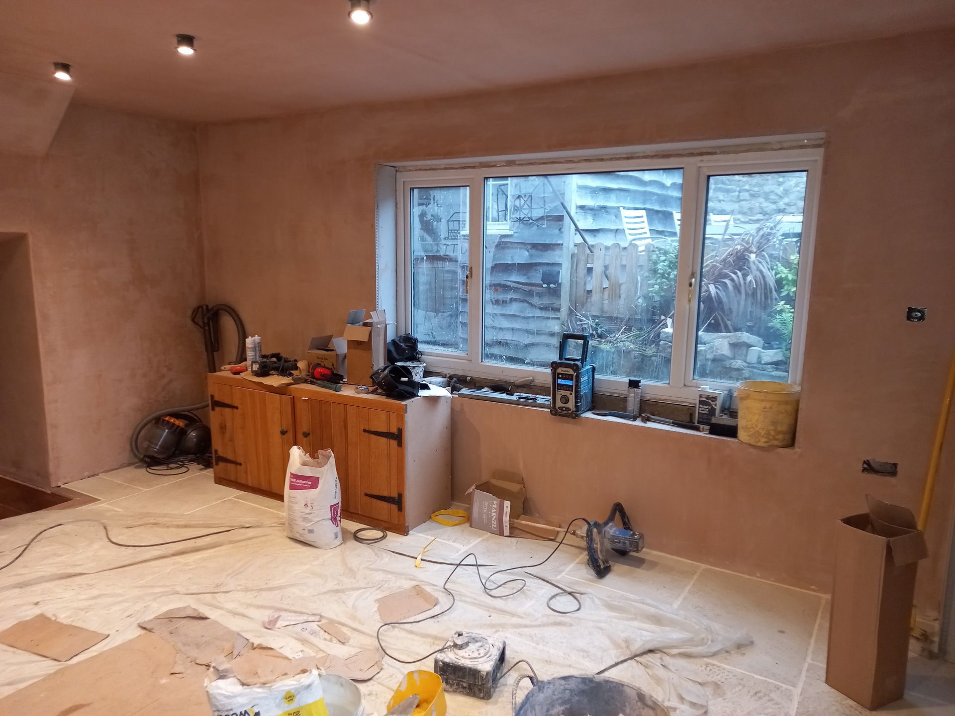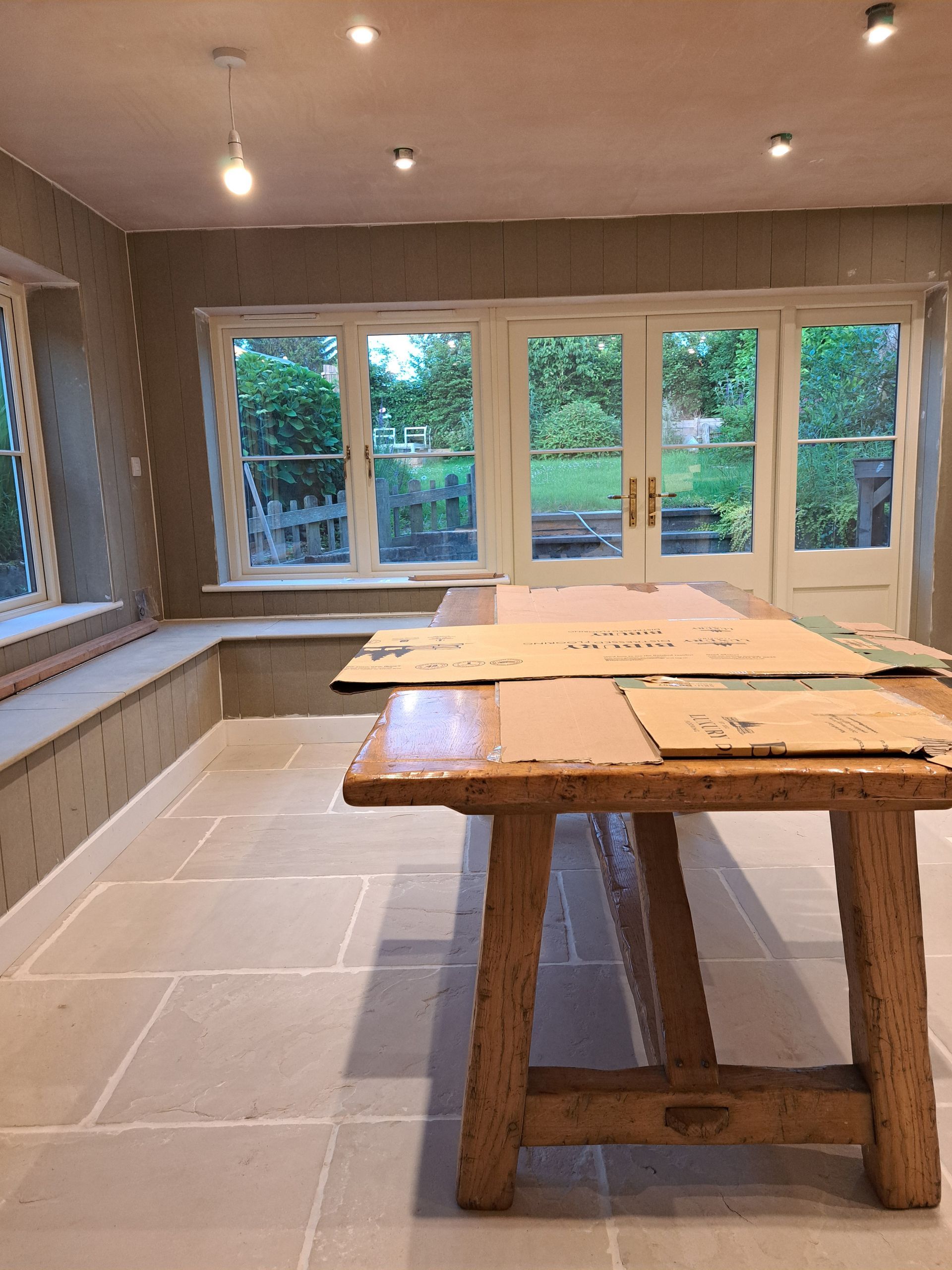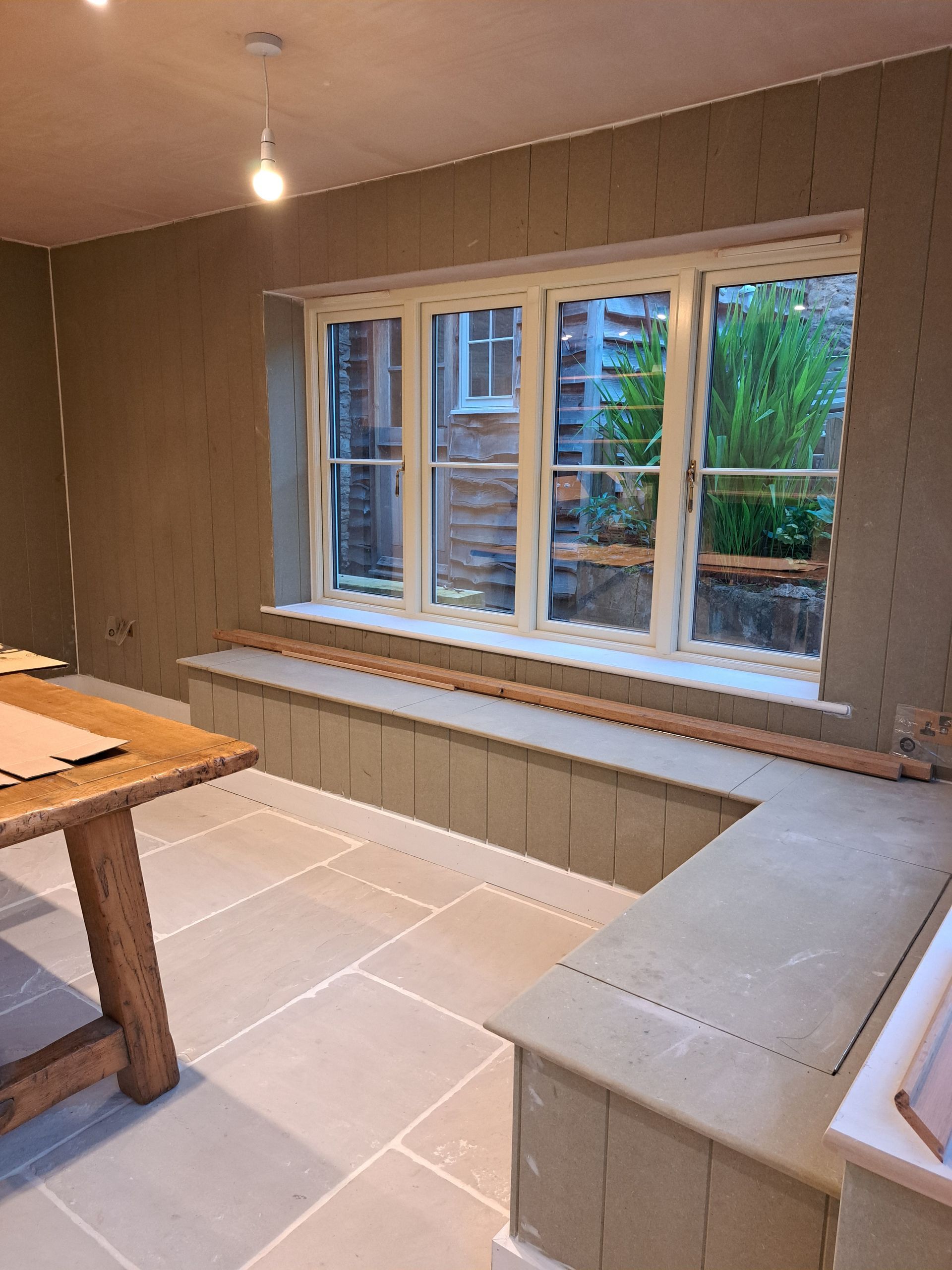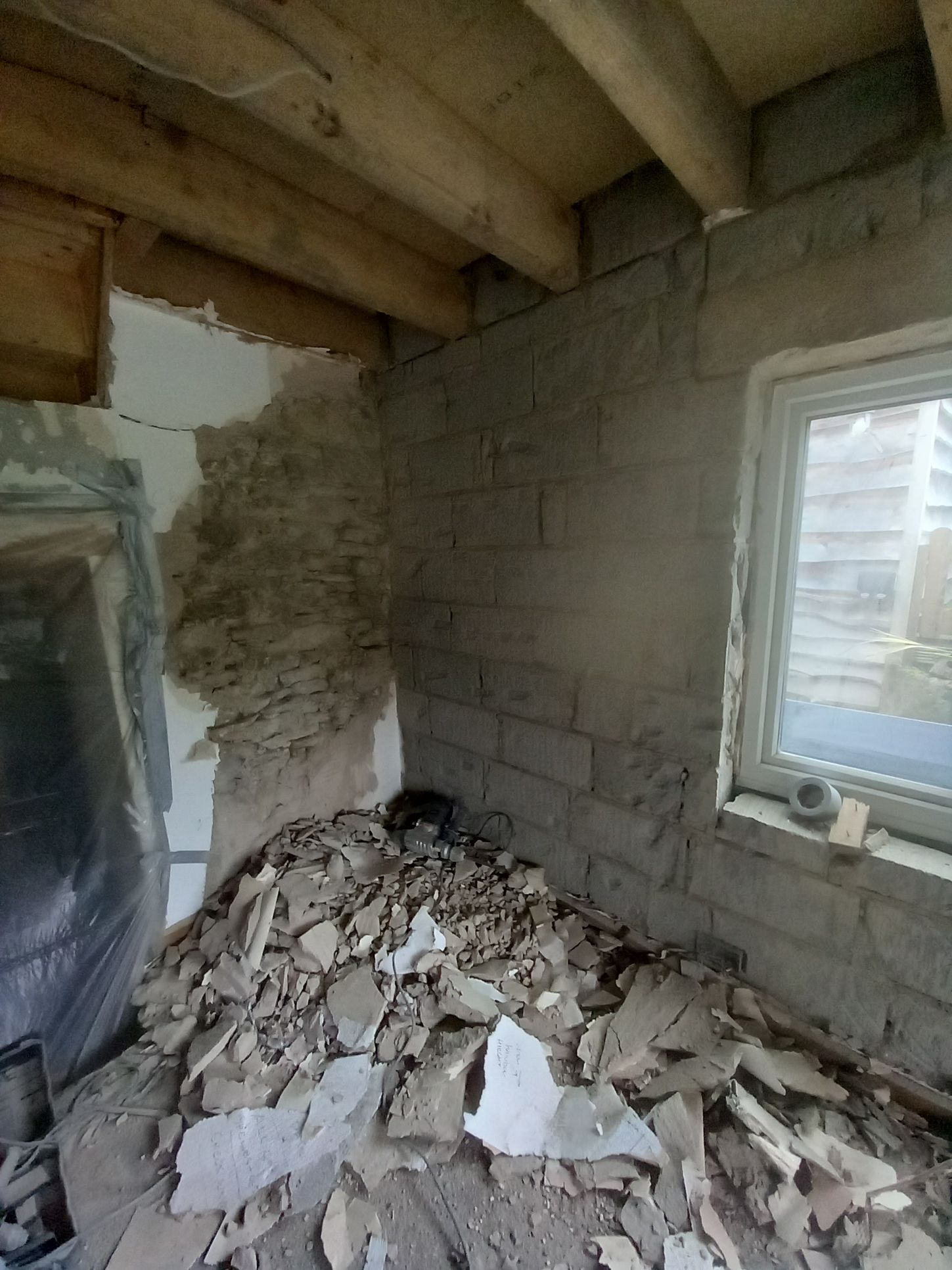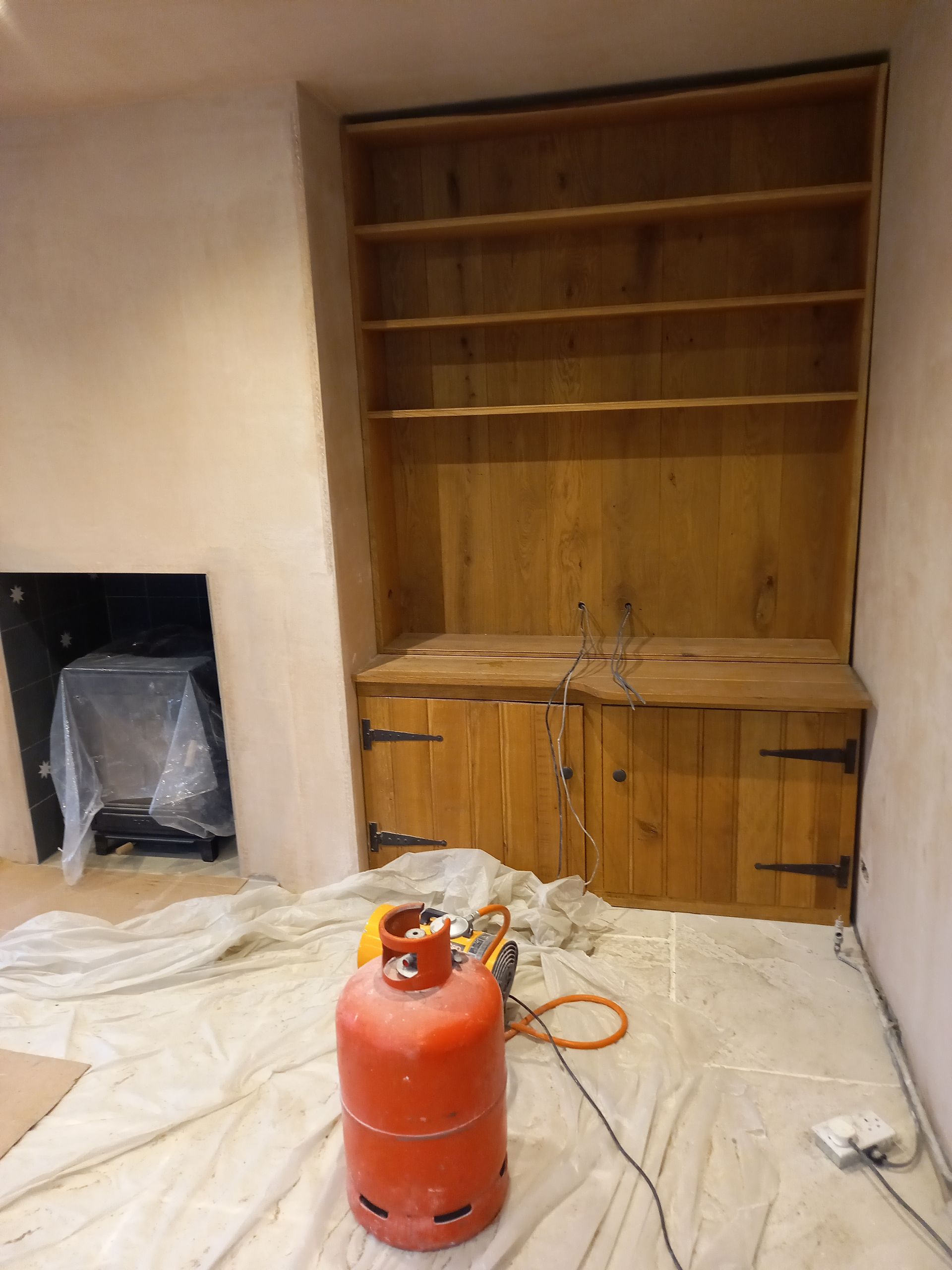 Work is been carried out to refurbish and alter a room with-in Ascot Cottage which comprises of taking the old Upvc French doors and windows out and making the opening wider to fit a pair of Timber French doors with window and fan light. Work is also been carried out to re-build the chimney breast to allow for a log burner, fully strip out the old walls and dampproof the walls, lay a new tiled floor then fitting a bespoke cladding board to the walls along with seating area.