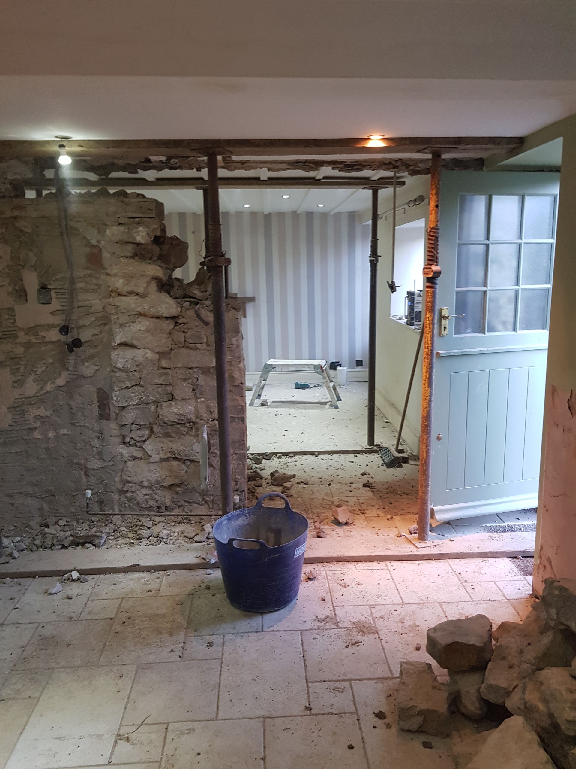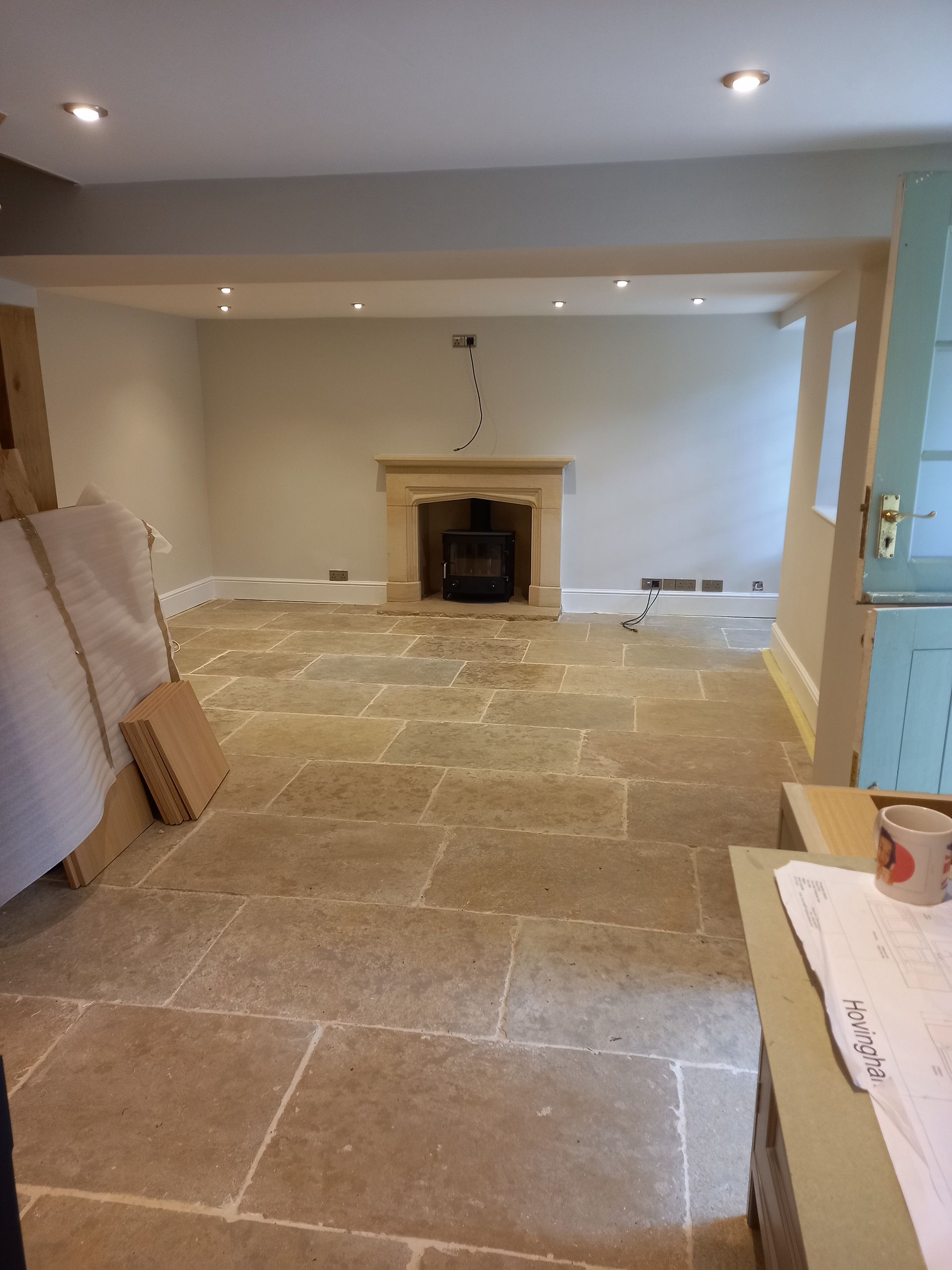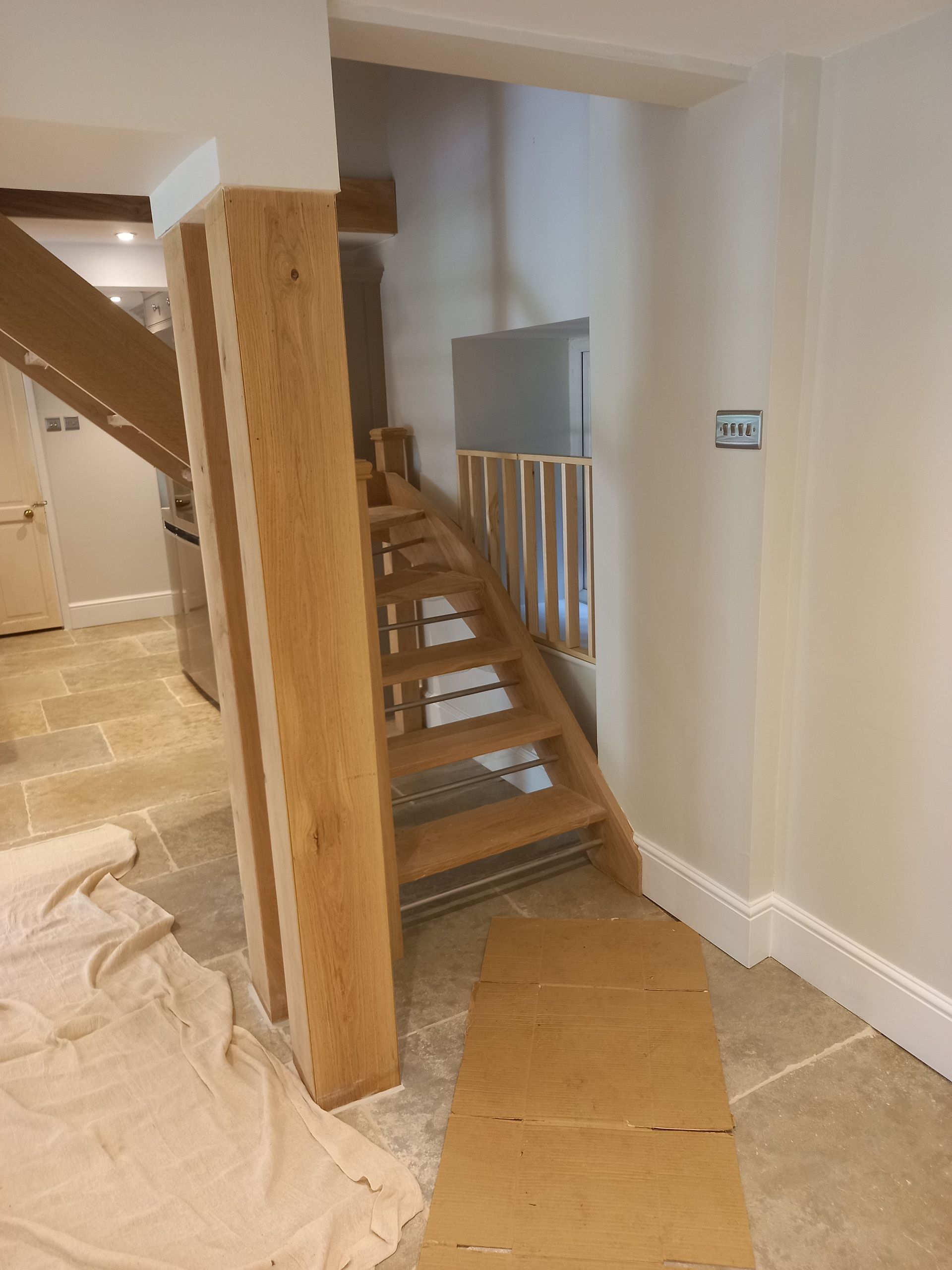 Work was carried out to remove a dividind load bearing wall between the kitchen and the lounge to make a large kitchen dining area, the room was re-plastered out, a stone fire place was fitted along with a Log Burning Stove, a Bespoke made Oak Stair Case was fitted.